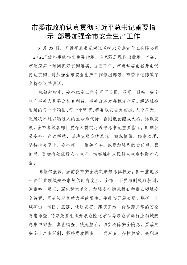 市委市政府认真贯彻习近平总书记重要指示 部署加强全市安全生产工作
