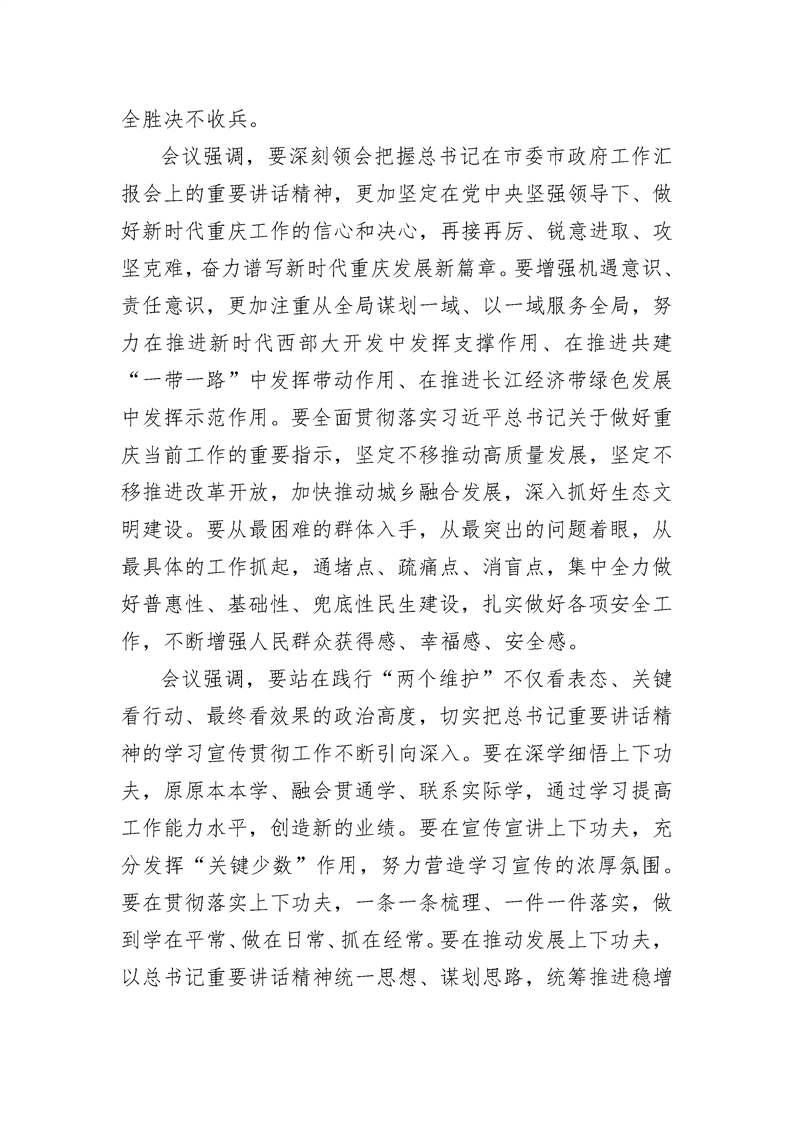 市政府党组扩大会议传达学习贯彻习近平总书记视察重庆重要讲话精神