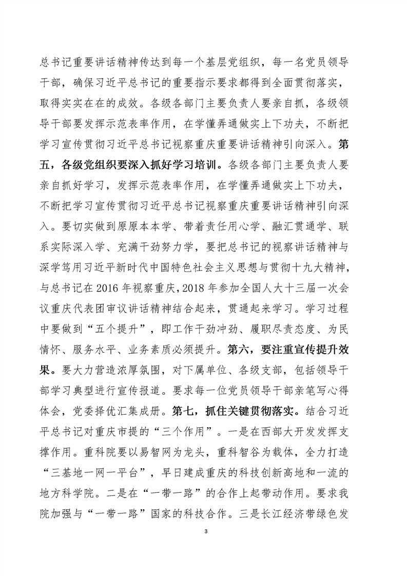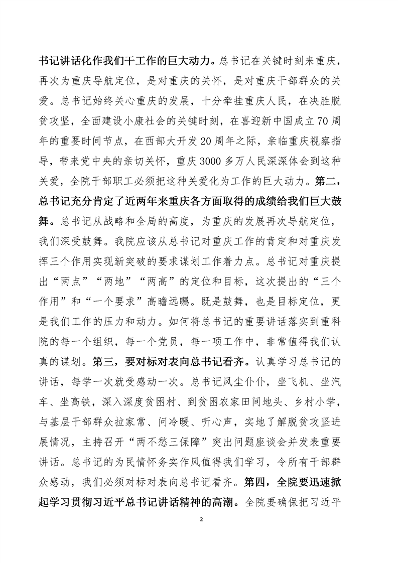 动员部署-党委书记何平在全院学习贯彻习近平总书记视察重庆重要讲话精神动员会上的讲话(摘要2019.5.9)